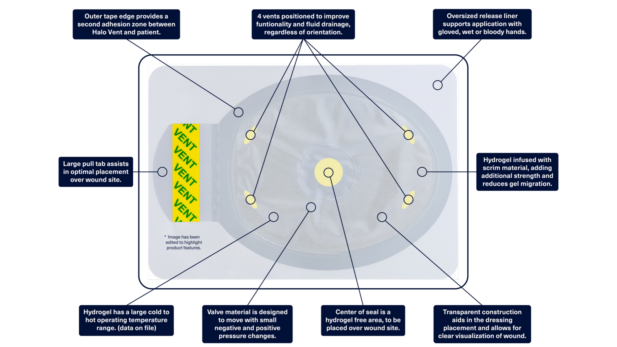 The Halo Vent and and Seal are an advanced chest dressings designed to treat penetrating chest wounds. They allow trapped air to escape while preventing air from re-entering, helping manage and prevent tension pneumothorax in emergency situations