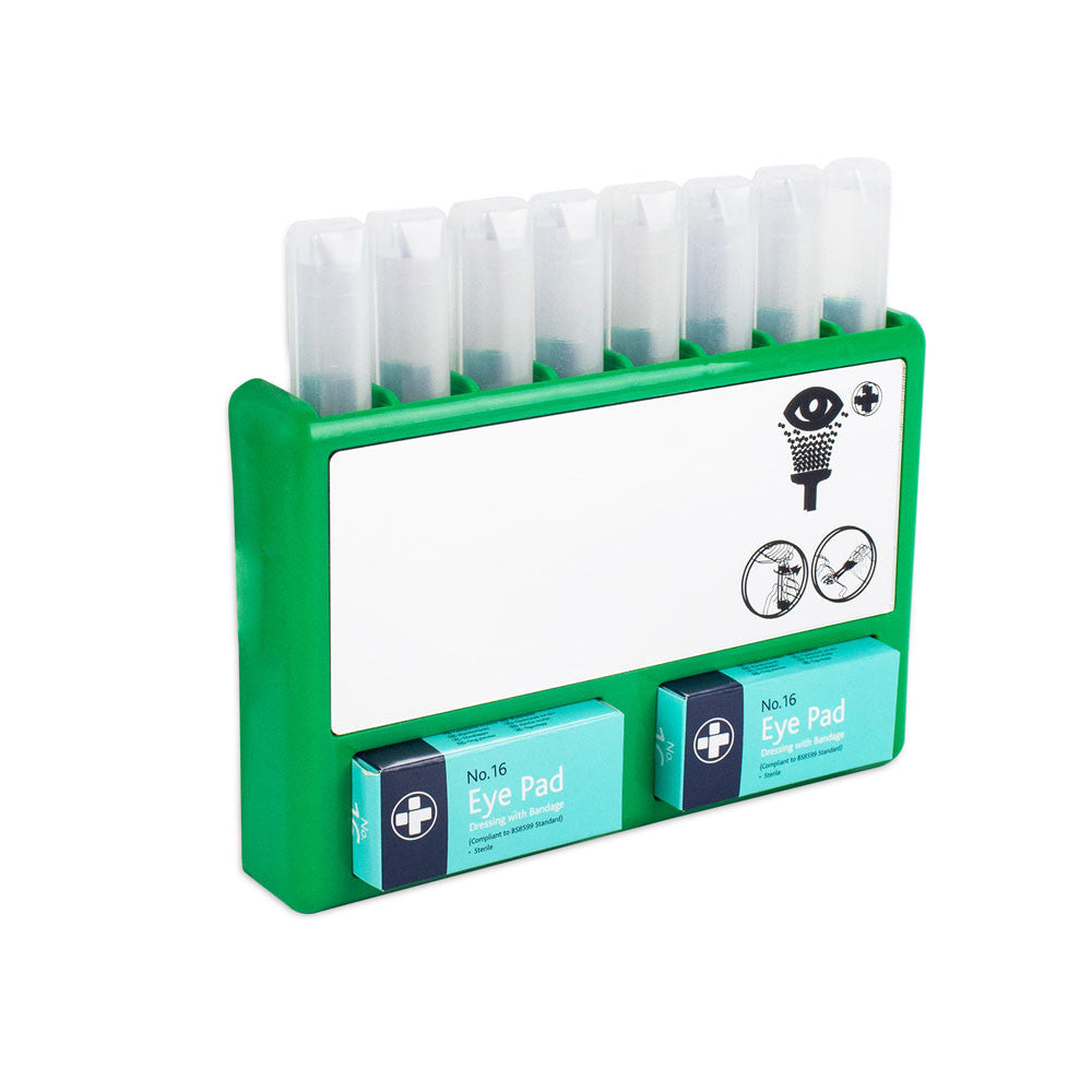 Wipeable, hard-wearing ABS plastic with illuminated printed instructions. Dust proof heavy duty cover keeps contents clean. Central Mirror for easy application. Contains easy-to-squeeze bottle with an eye cap, allowing the eye to be irrigated easily and efficiently.