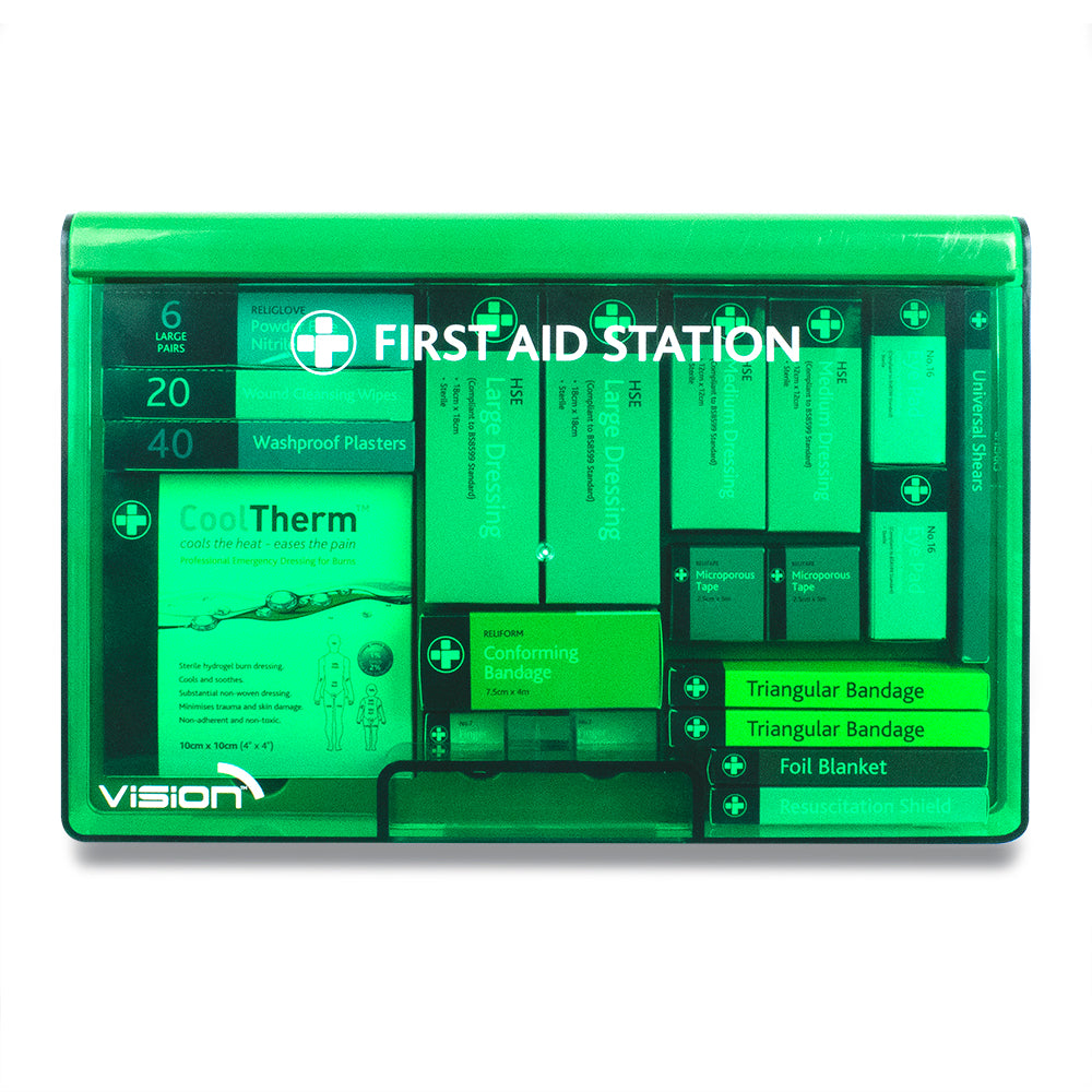 The First Aid Wall Station features the same components as our standard workplace kit.