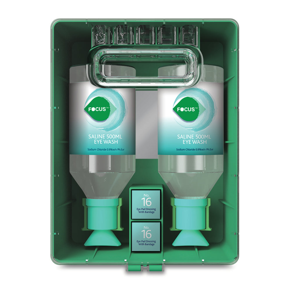 Wipeable, hard-wearing ABS plastic with illuminated printed instructions. Dust proof heavy duty cover keeps contents clean. Central Mirror for easy application. Contains easy-to-squeeze bottle with an eye cap, allowing the eye to be irrigated easily and efficiently.
